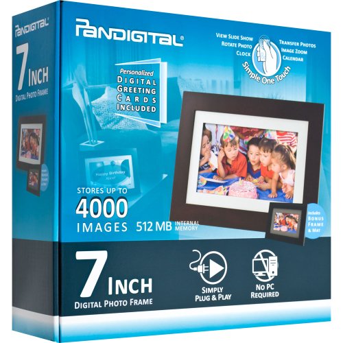 - Hold up to 4000 Photos on 512MB Internal Memory The Pandigital Photo Frame offers complete media support and allows you to copy photos and files from your memory card, digital camera or PC for quick and easy display.