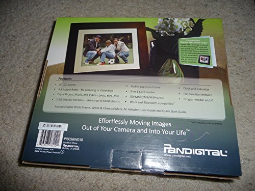 Display up to 6400 favorite images with the 1GB of memory this digital frame delivers. It has a 6-in-1 card reader, plays music and video, has an 800 x 600 resolution and a 4:3 aspect ratio with no photo distortion, and is Wifi and Bluetooth compatible (separate adapter required, not included). The remote even allows you to control the show from anywhere in the room! No PC required! Brownish black frame coordinates with most decors. Includes power adapter, charcoal and white mattes and remote control.
